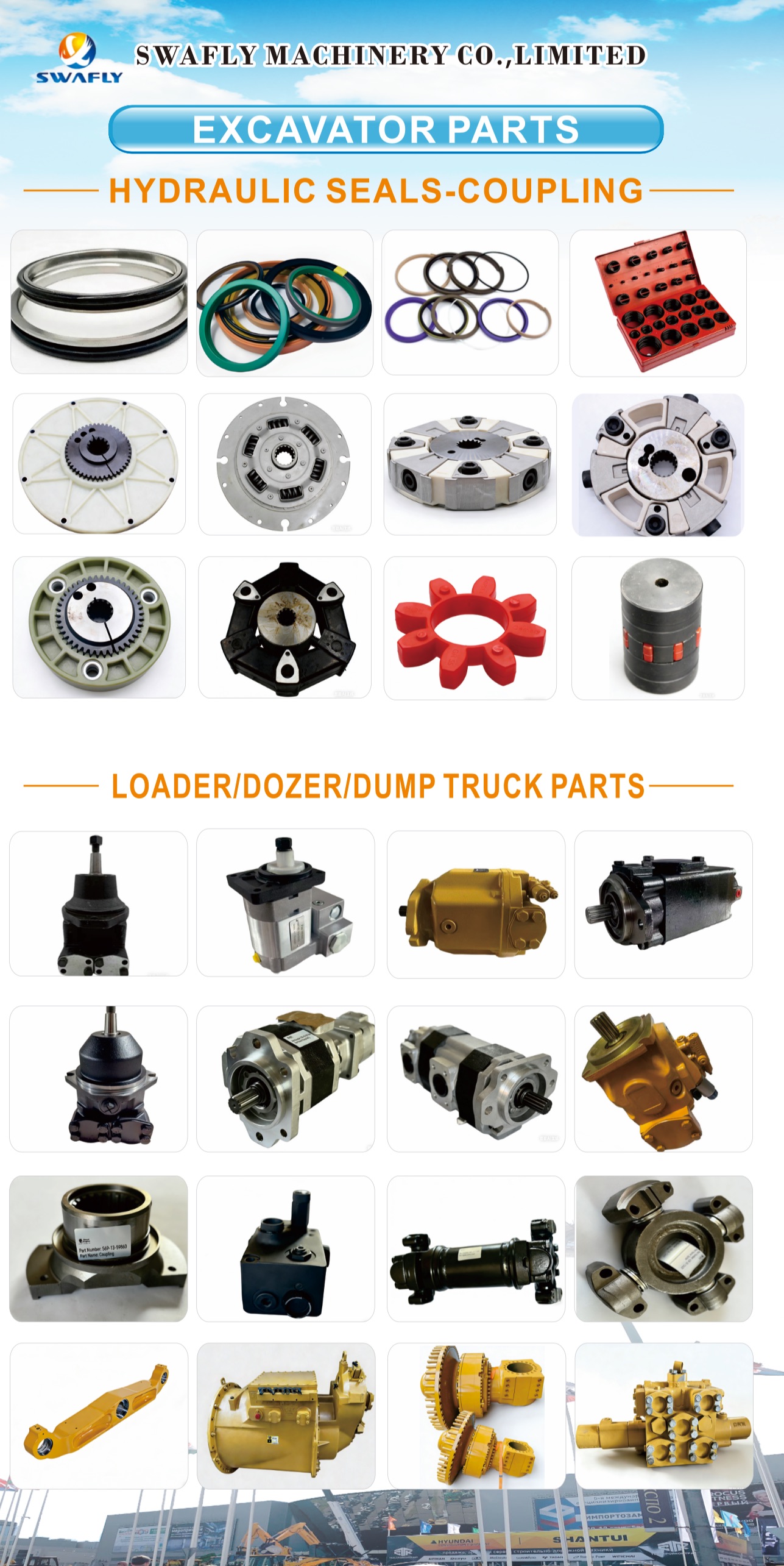 Déanaimid freisin go leor leor loader, dozer, agus páirteanna trucail dumpála. Rudaí cosúil le tiomántáin deiridh, caidéil hiodrálacha, mótair taistil, mótair swing, agus comhpháirteanna troma eile a bhfuil na meaisíní seo ag brath orthu. Is athsholáthairtí ar ardchaighdeán iad an chuid is mó díobh a oireann do bhrandaí coitianta gan aon stró.