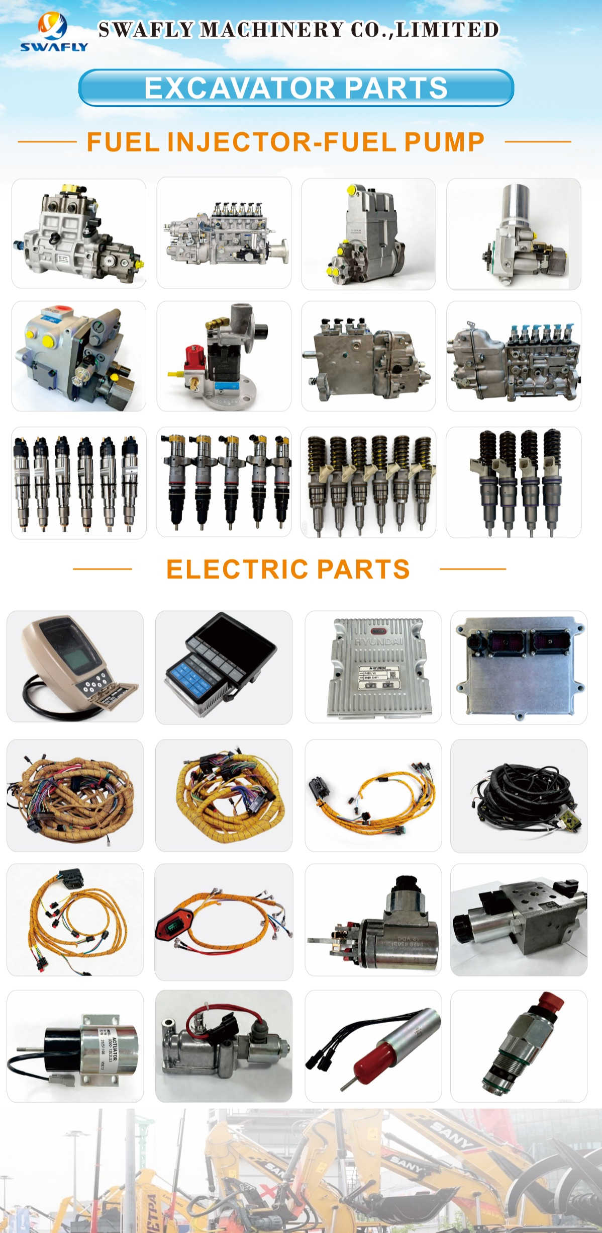 Clúdaíonn na breisithe nua dhá chatagóir go príomha. I rannóg an chórais breosla, cuireann Swafly rogha i bhfad níos leithne de chaidéil insteallta agus insteallairí breosla ar fáil atá oiriúnach do bhrandaí tochailteoirí a bhfuil tóir orthu lena n-áirítear Caterpillar, Komatsu, Hitachi, Hyundai, agus Volvo. Cibé an caidéil inlíne, caidéil dáileacháin, nó injectors iarnróid coitianta é, is féidir le custaiméirí aonaid aonair nó tacair iomlána (6 nó 8 instealladh) a fháil go díreach ón stoc.